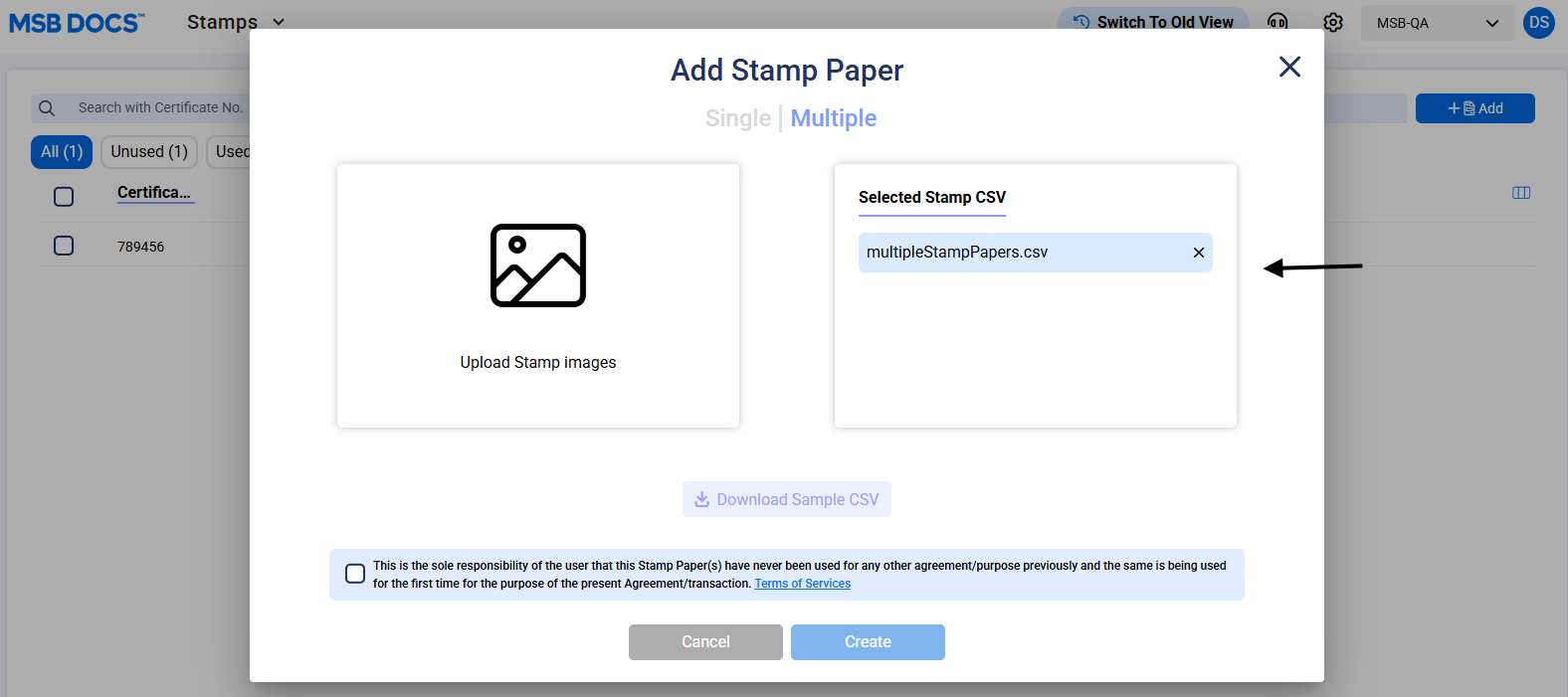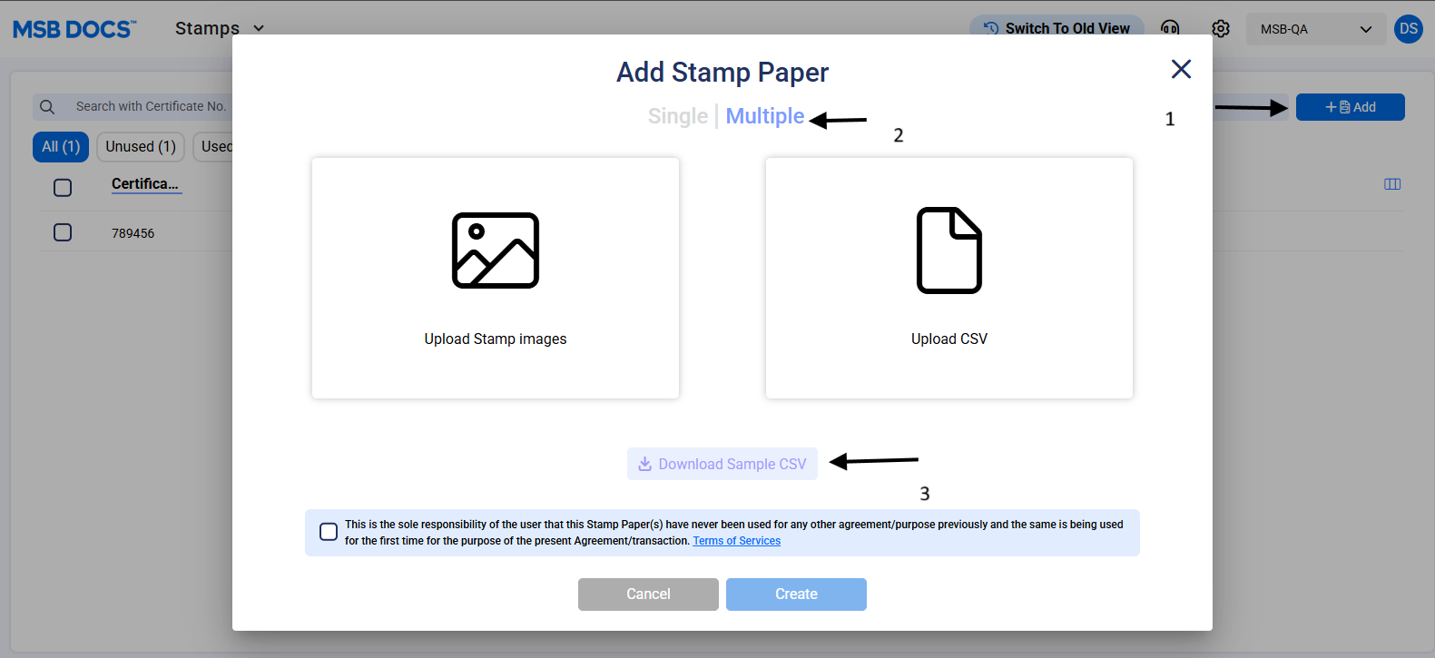 1. Click on “Add” button to upload a stamp paper into the system. Select Multiple to add multiple stamps in one go. Download the CSV file to add details.