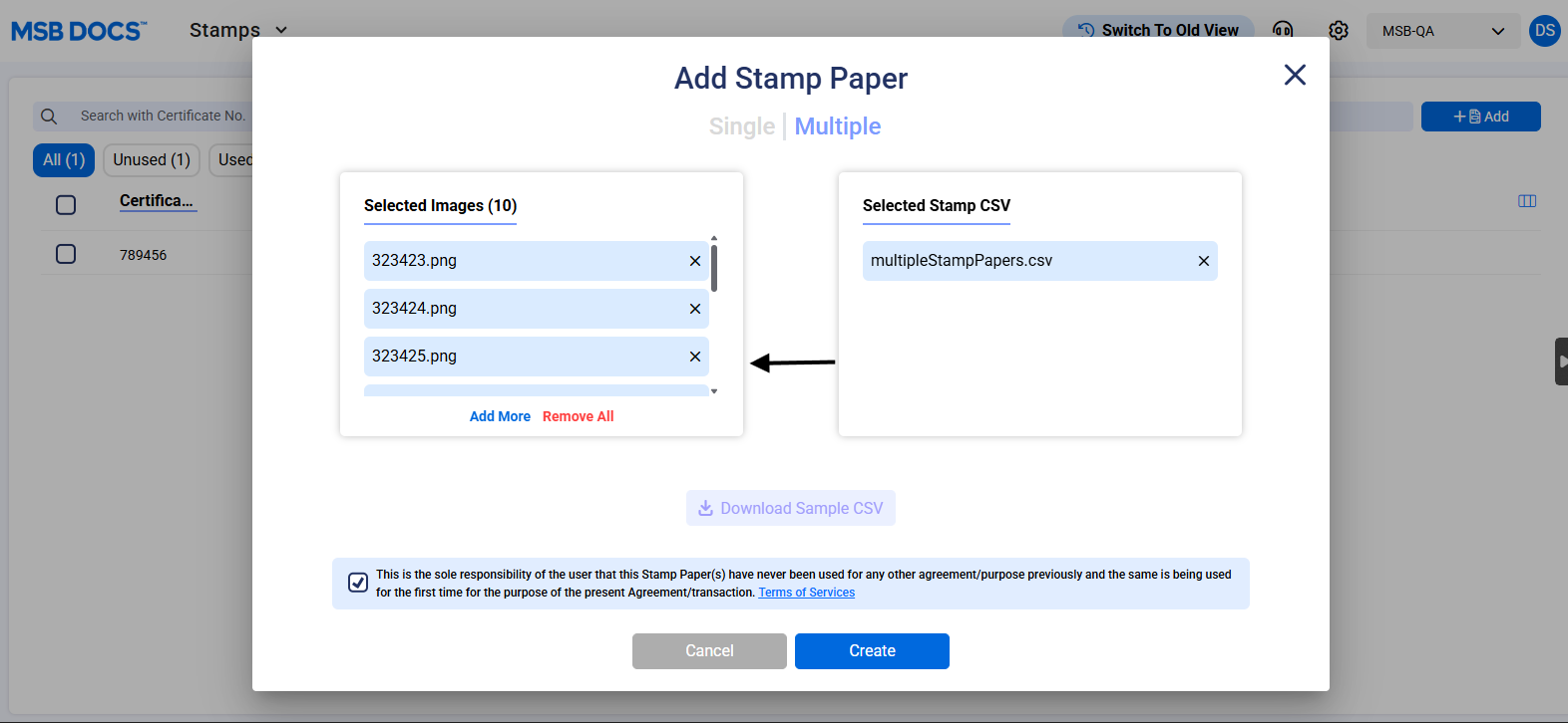 2. Fill all the details in downloaded CSV file and upload the same in Upload Stamp (CSV) option and Upload Stamp images renamed as Certificate no.