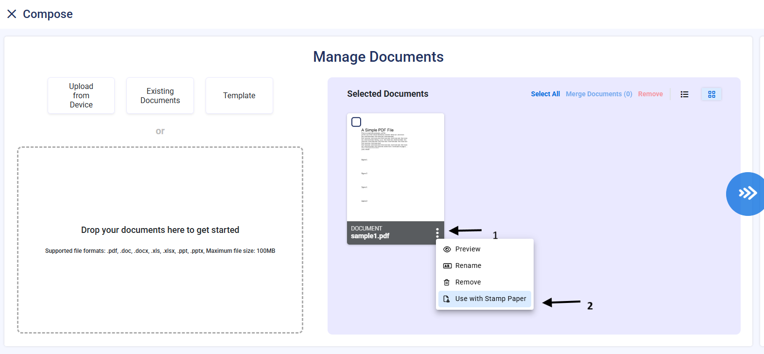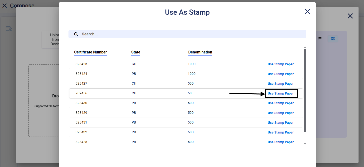 2. Upload a document, click on the 3 dots, and select ‘Use with Stamp Paper’. Select the stamp paper by clicking on Use Stamp Paper.