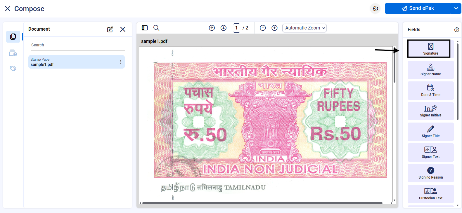 The document will be uploaded along with the attached Stamp paper, the stamp paper being the first page followed by the document. Drag and drop the required signature tag and send it to the signer to complete the process.
