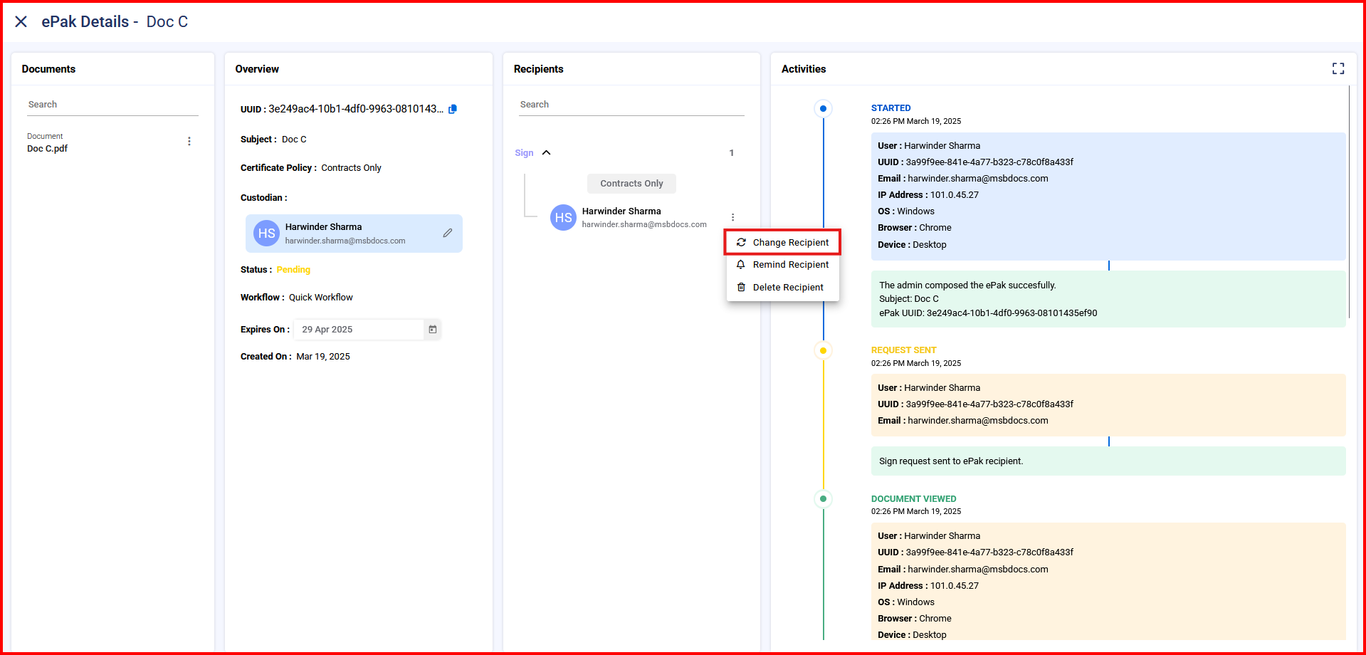 2) On the ePak details page, under Recipients, Click on Change Recipient next to a signer’s name. A text box appears that will allow you to add a new signer. You will only be able to change signers/reviewers that have not yet signed the ePak.