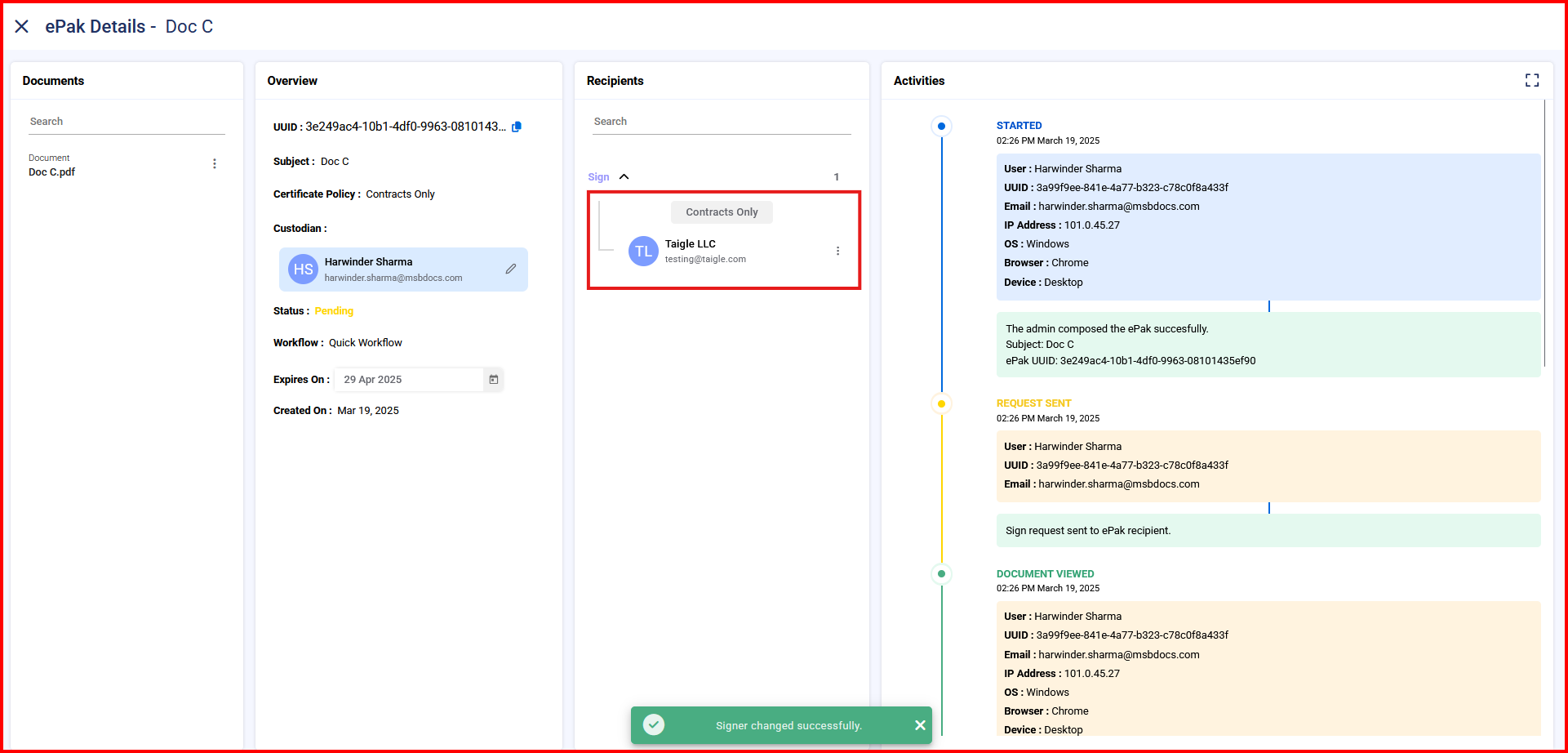 - The ePak will no longer be available to the previous signatory and will get removed from their Inbox. The new signer will in turn be notified via an email and this ePak will move to his/her Inbox folder.