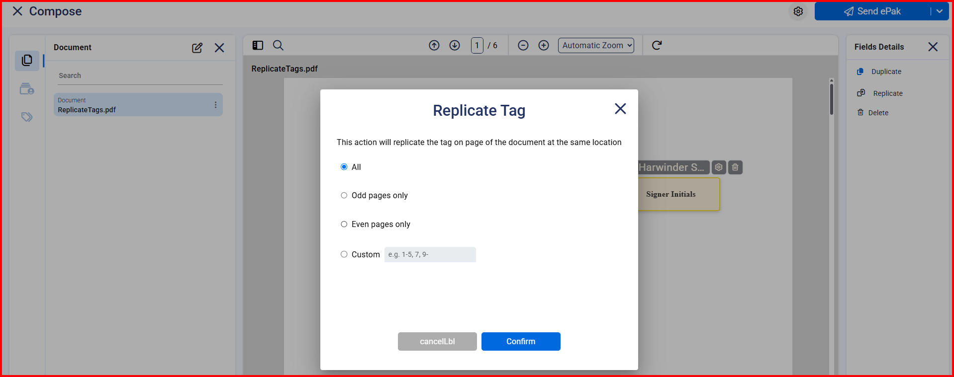 When you click on Replicate, the user will be asked if they wish to replicate the tag on All, Odd Pages Only, Even Pages Only or Custom. Users can use a hyphen to specify the range of pages to apply the tag and a comma to list individual pages.Select any option and click on Confirm.