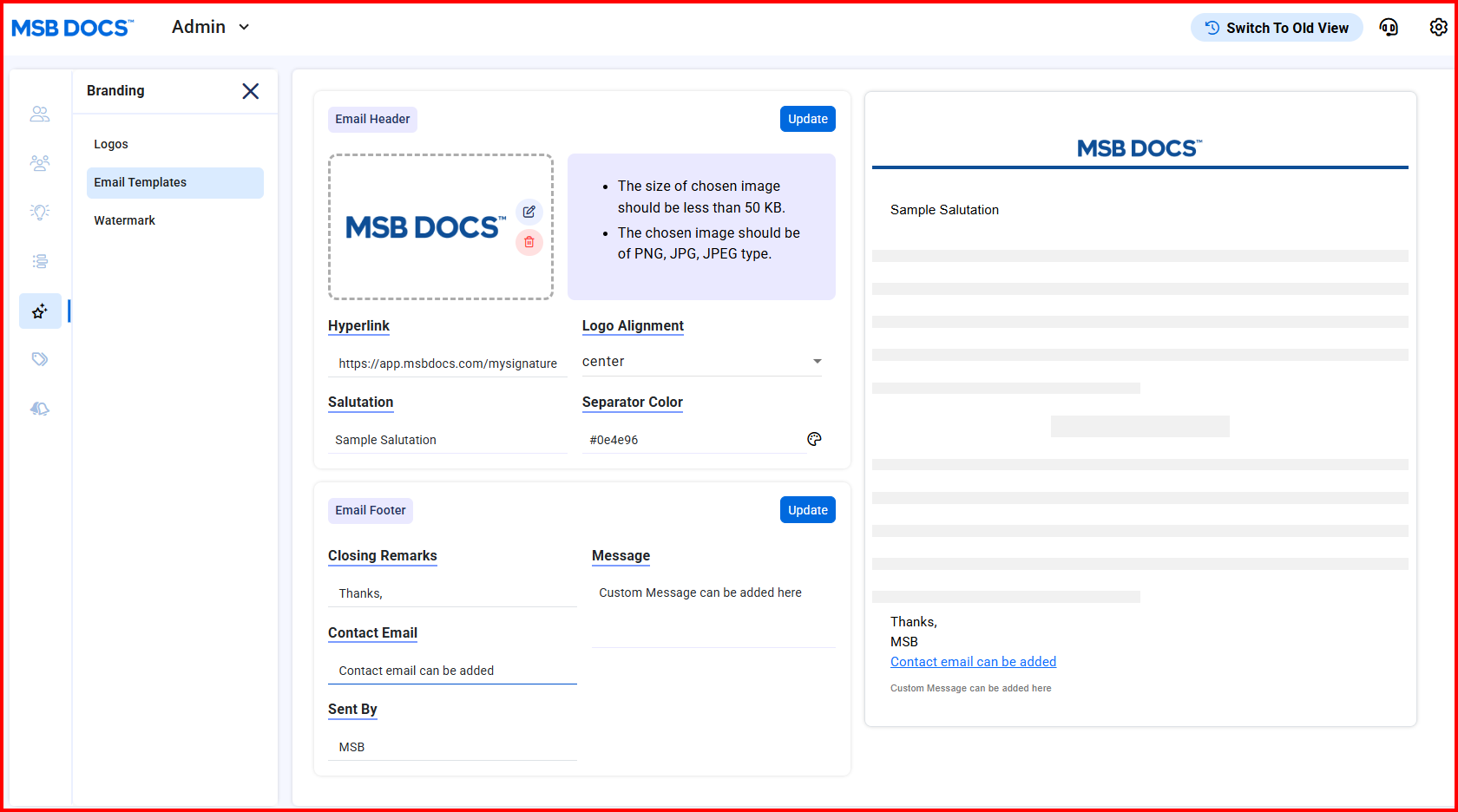 Admin will also have a preview option such that the changes made to the header and footer will be visible as an email preview within the Admin panel.