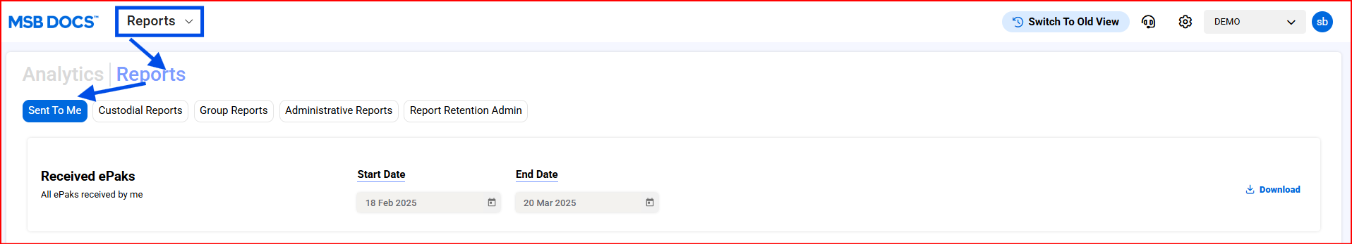 Click the Reports link in the navigation bar and select ‘Sent to Me’. The Received ePaks report will be displayed. Enter a start date and end date and Click Download to download the report data.