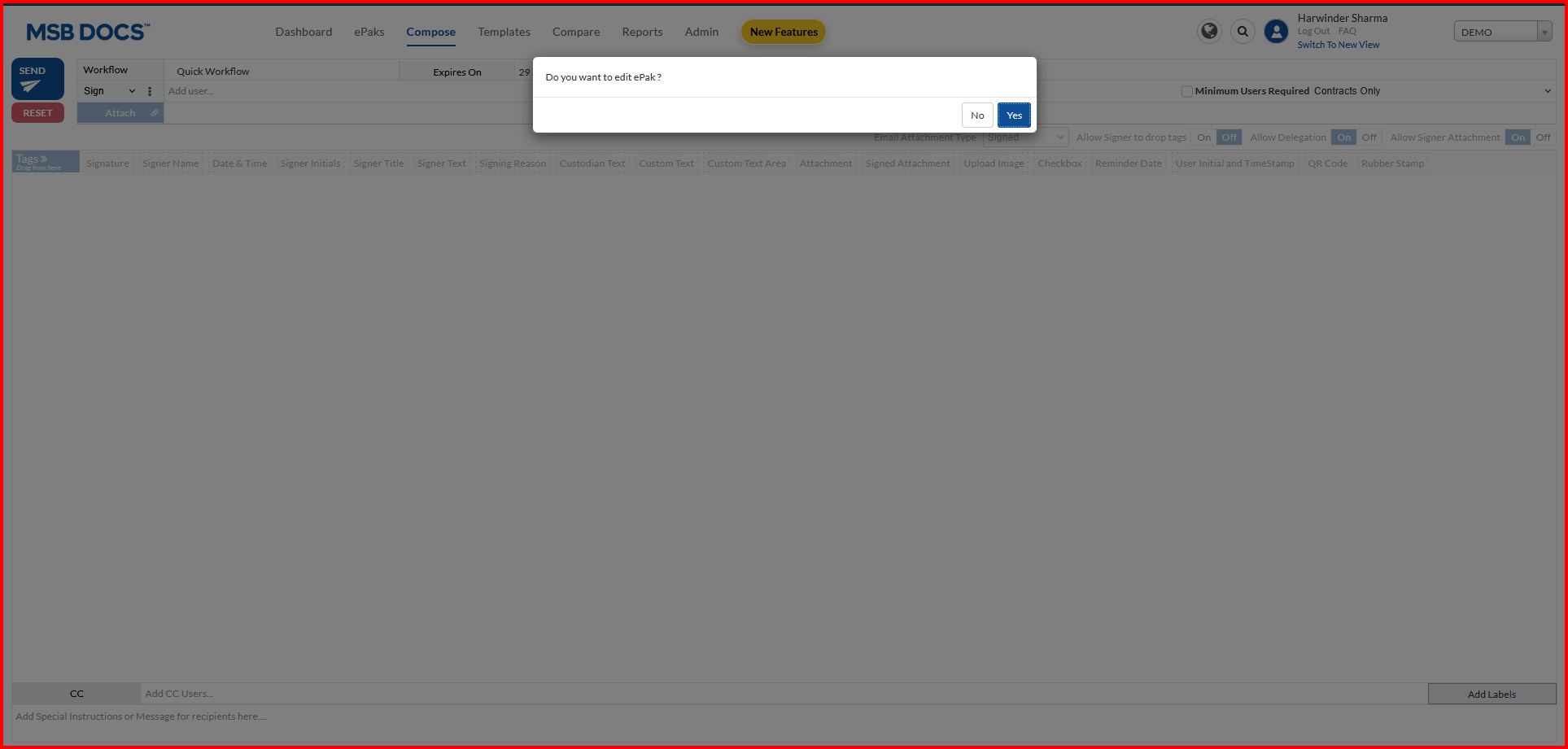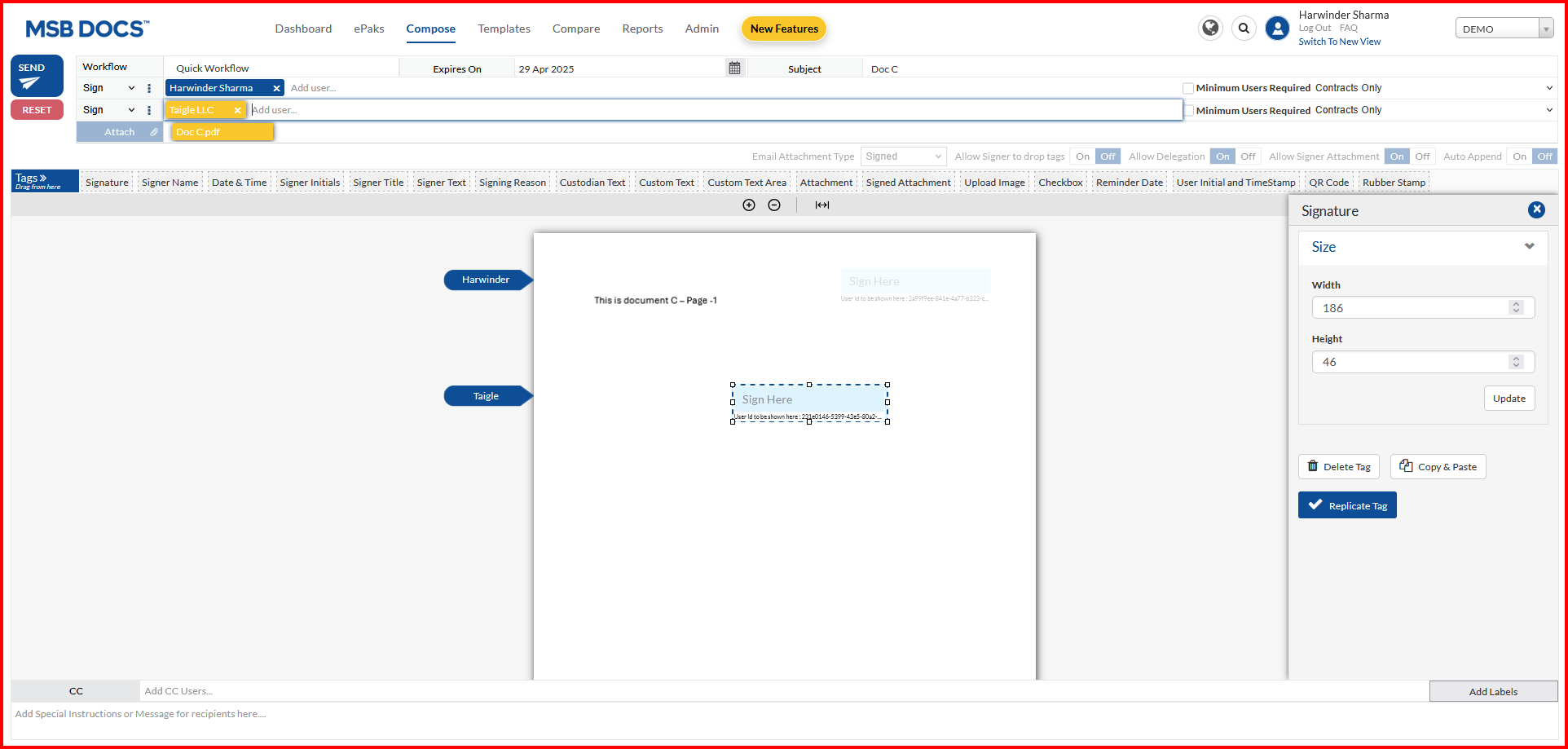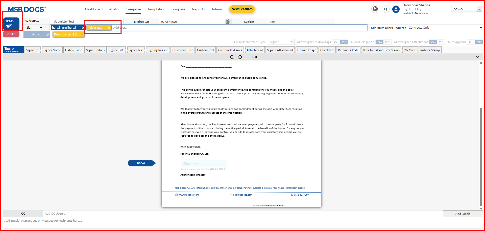 On the Compose page. Users can edit/add the signers or add/edit the workflow state and click on Send.