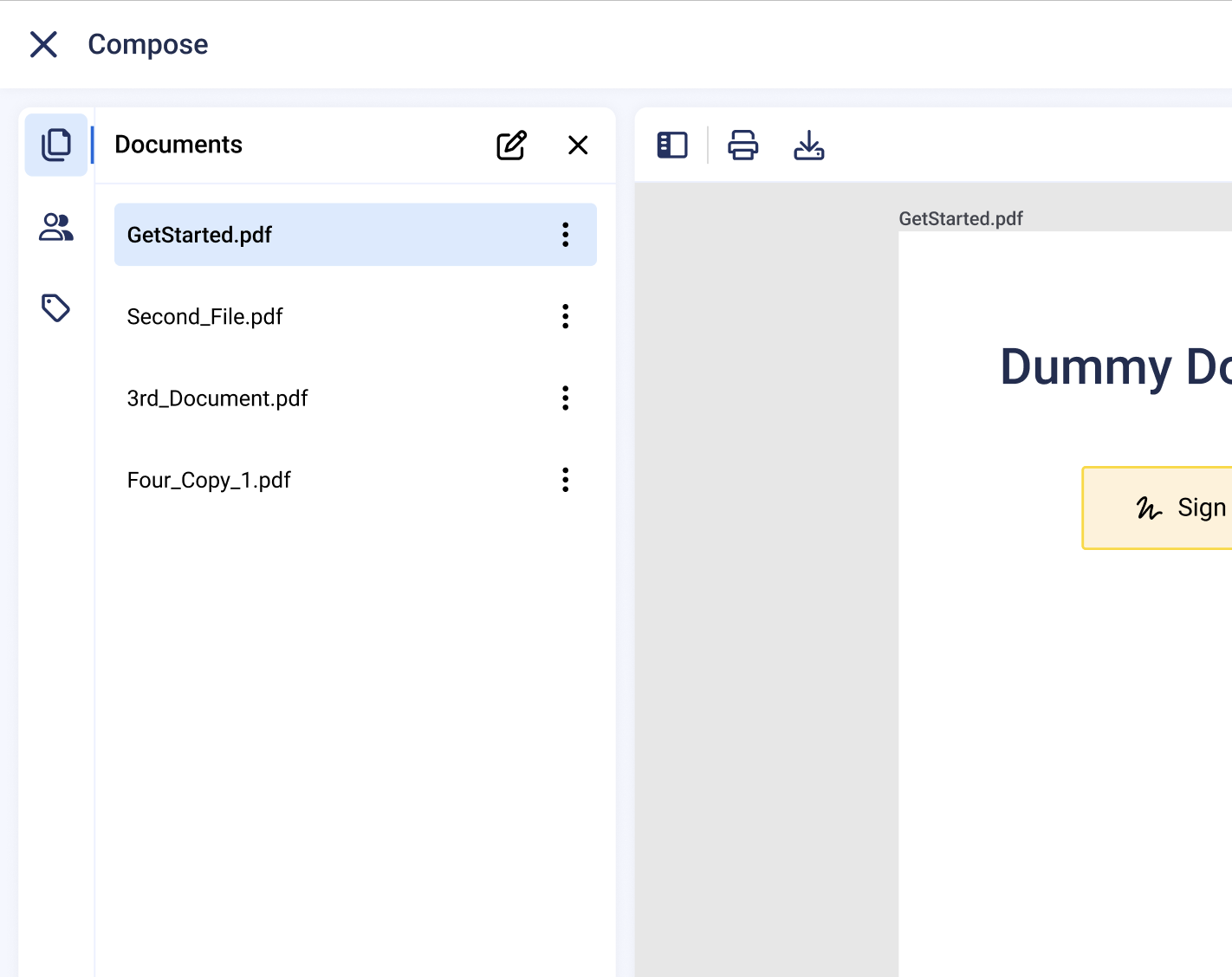 If you have selected multiple documents while creating an ePak on Compose page, it will display all the documents in a row on top of the eSignature tag configuration screen.