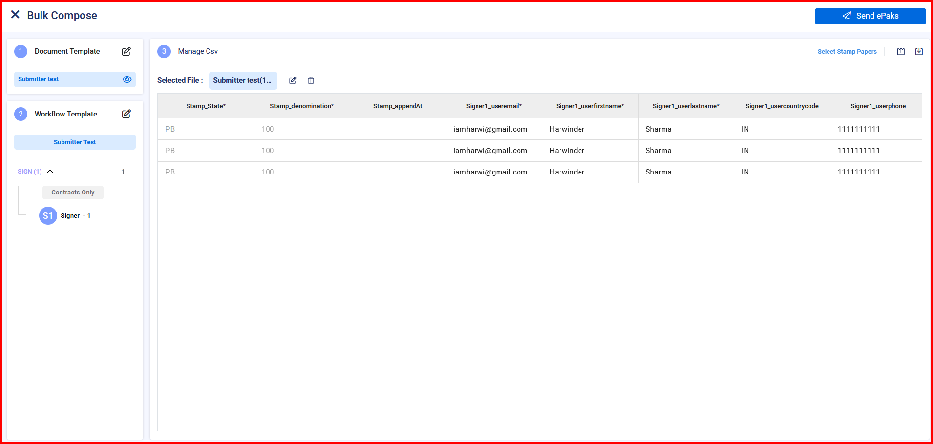 Users can select any available stamp paper type and edit the quantity of the stamps and All stamp paper fields will be visible in the grid along with the existing bulk compose fields. Stamp paper details will include State Code, Denomination, and the quantity available. The user can select any type of unused stamps from this screen. Once selected the user can deselect all the stamp papers with one click. The user can also click on the add stamps button, the stamp details will be prefilled in the CSV.