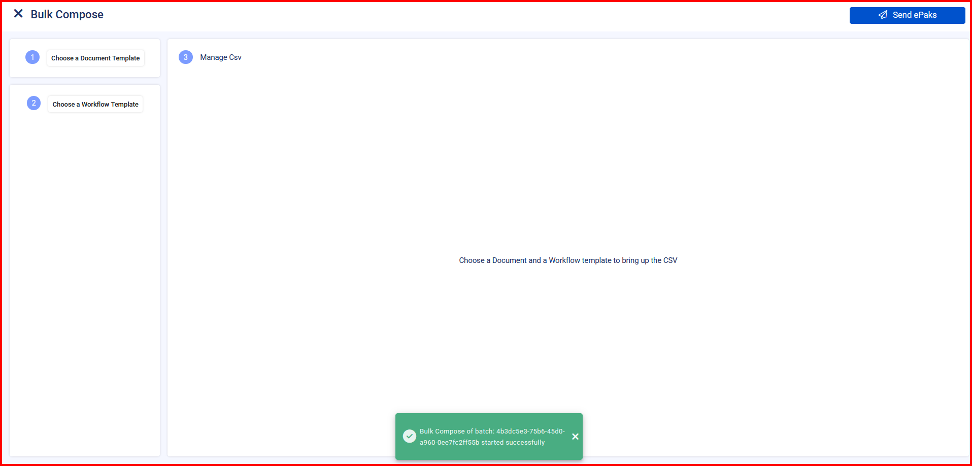 Once the user has finished the uploading process, the CSV will be rendered on the interface and the user can proceed to bulk compose ePaks. Once done, a message is displayed indicating how many ePaks along with stamps were sent successfully.