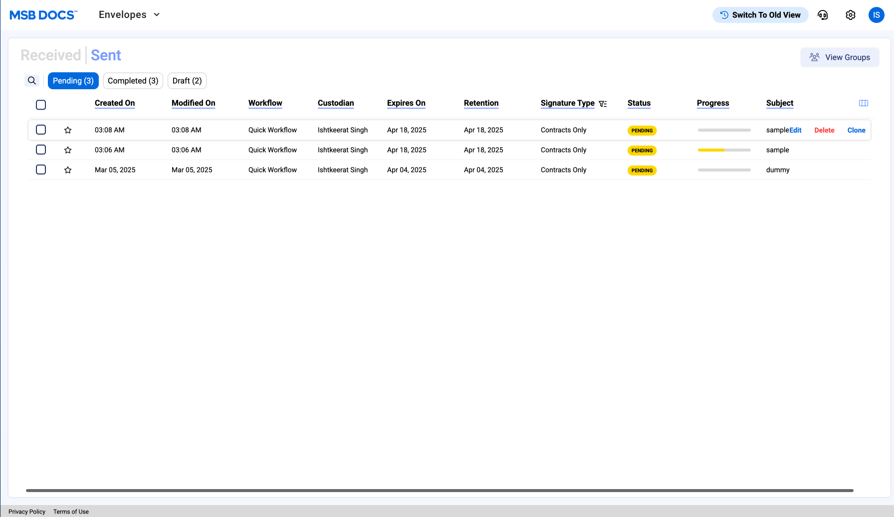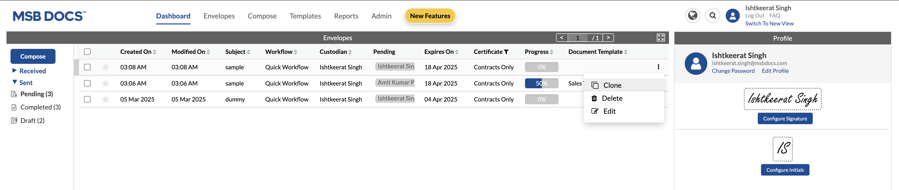 MSB allows users to clone an existing ePak. The feature is configurable and by default the ePak clone feature will be disabled. Custodian can select an ePak from any of the sent folders and click on Clone button. System will display a compose page with the ePak workflow and documents.
