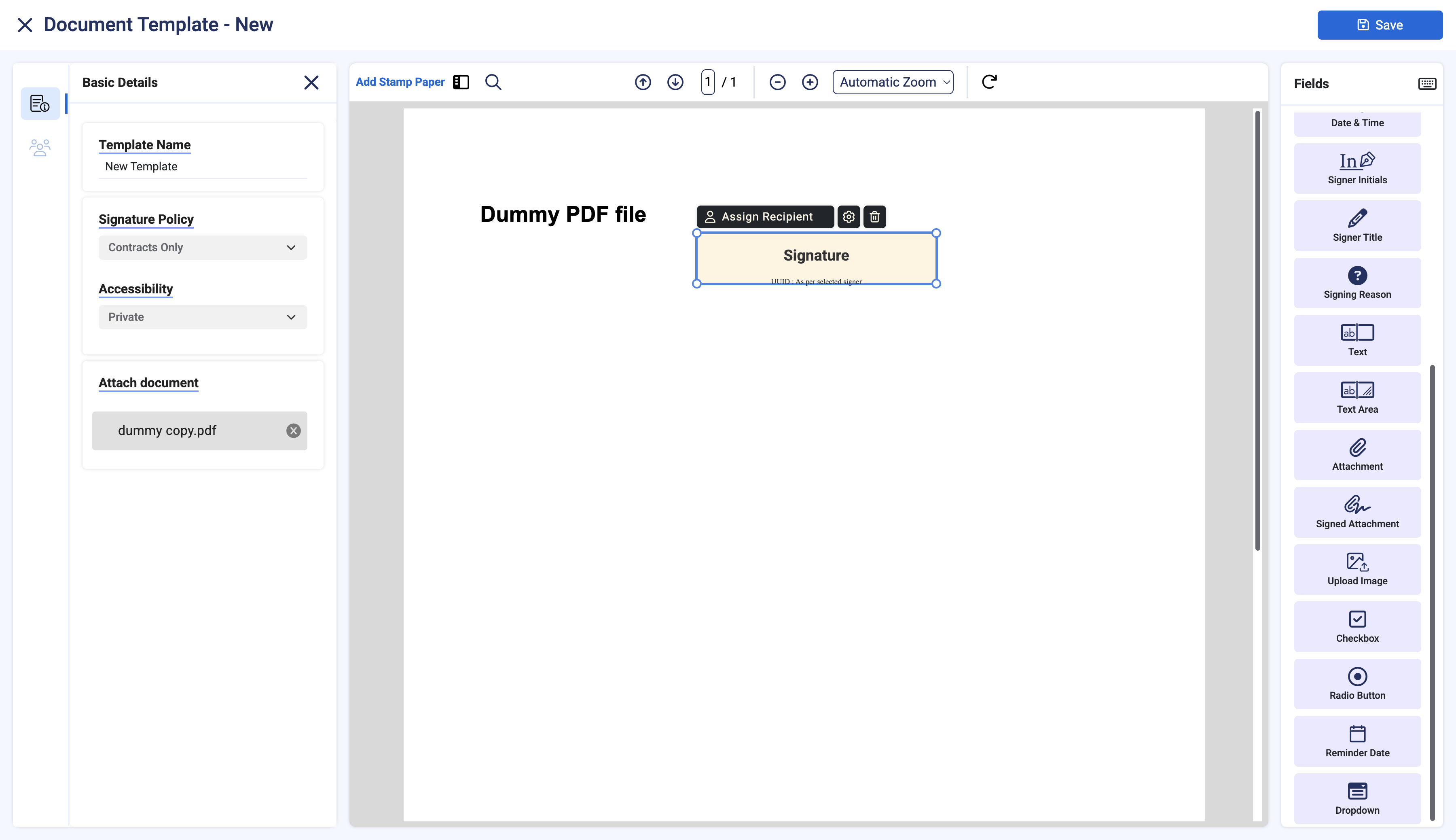 2) Add a Template Name, select a signature policy, Choose the accessibility of your document template. You can either make it Public, Private or Group. Attach a document (optional). If you are using a PDF that contains pre-existing form fields, you can map it to signers. Each fillable form field can either be assigned to a signer or left unassigned to be filled by any signer and no one in specific.