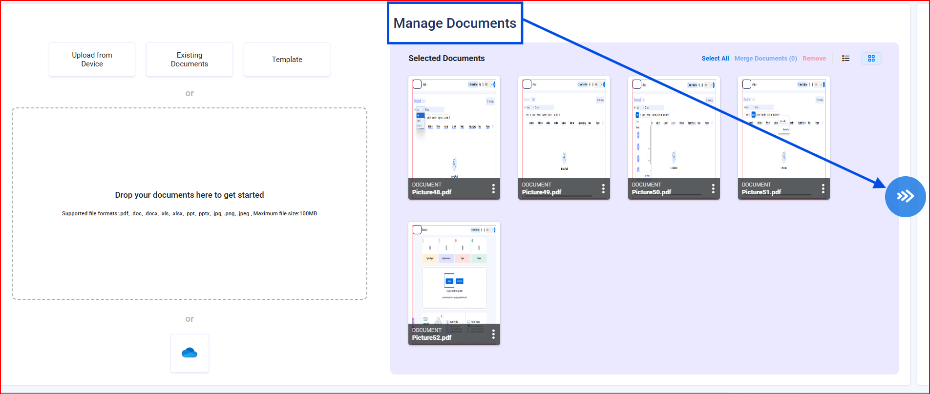 2) You can choose to upload a file from Your system, Existing Documents or Document Templates. Once the document is uploaded, you will be navigated to the Manage Documents Page. You may choose to upload multiple files at one time.