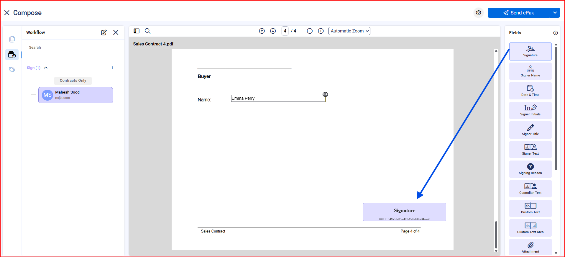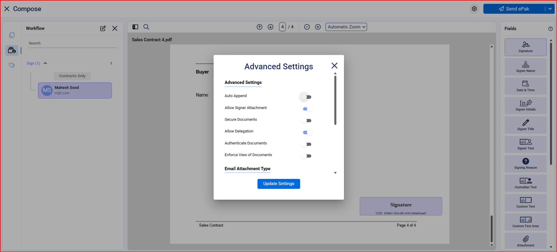 - Alternatively, you may select to turn on ‘Auto-Append’ signatures. Doing so will automatically append signatures to a new page at the end of the document for all signers within the workflow. You will not need to place signature tags if you select to turn on ‘Auto-Append’.