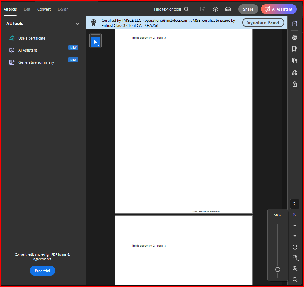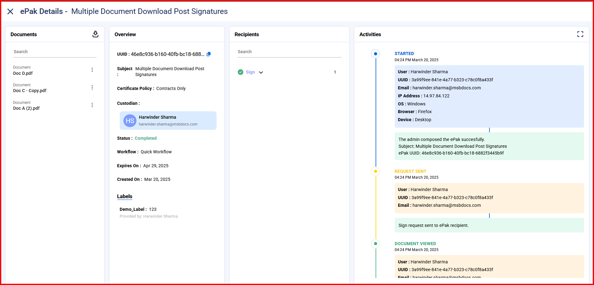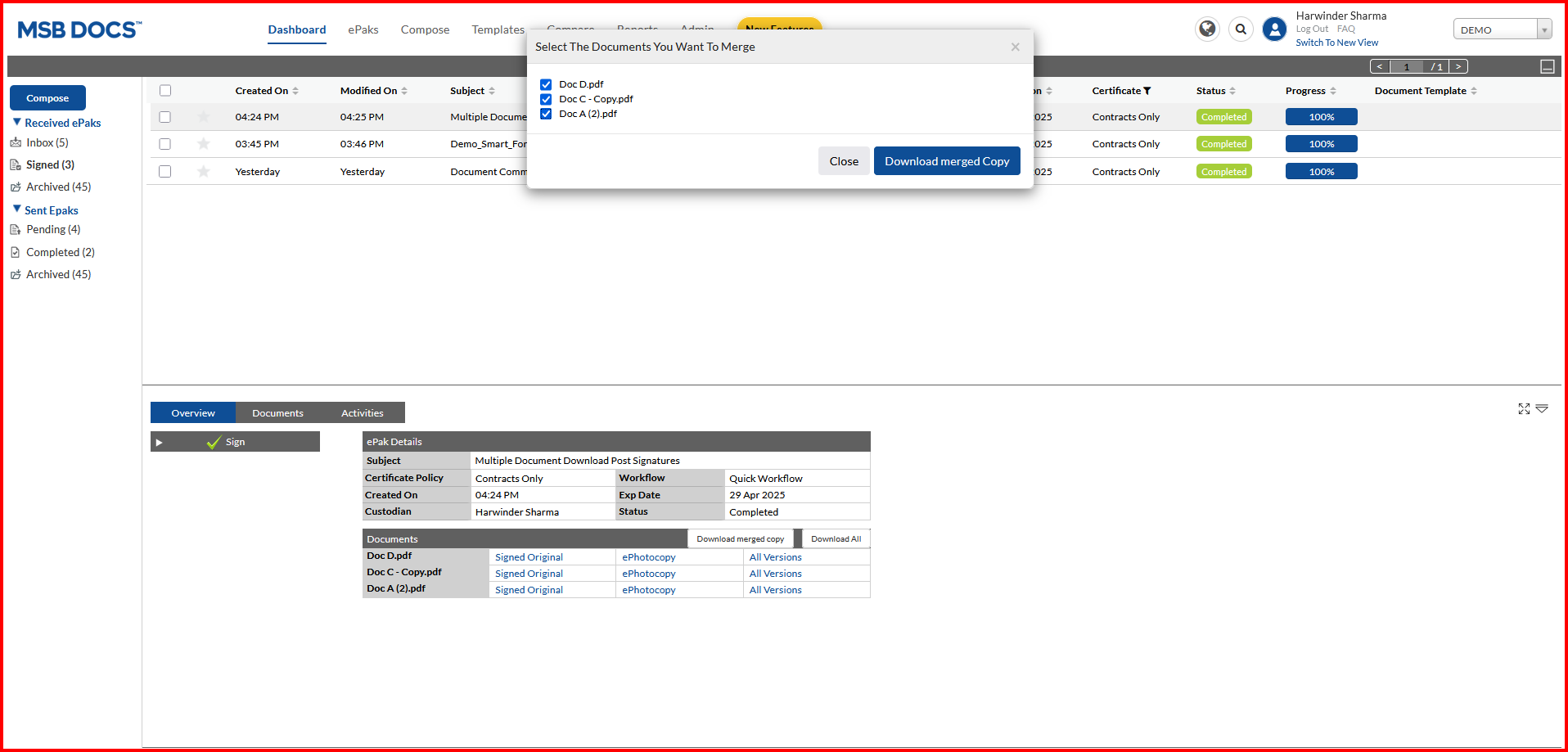 Custodian users can choose to download a merged copy of the attached documents. Users can select epaks signed with electronic signature policy having more than one document attached to it. System provides Signed Originals merged into one file locked with MSB certificate