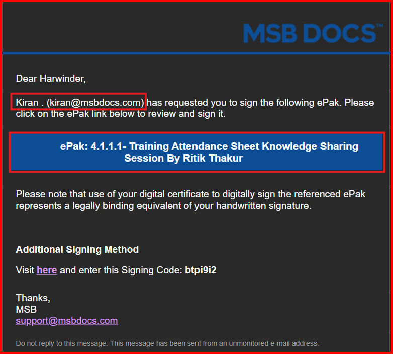 The email requesting your signature notifies you of the person requesting your signature. This person is the ePak Custodian. The email also identifies the name of the ePak.