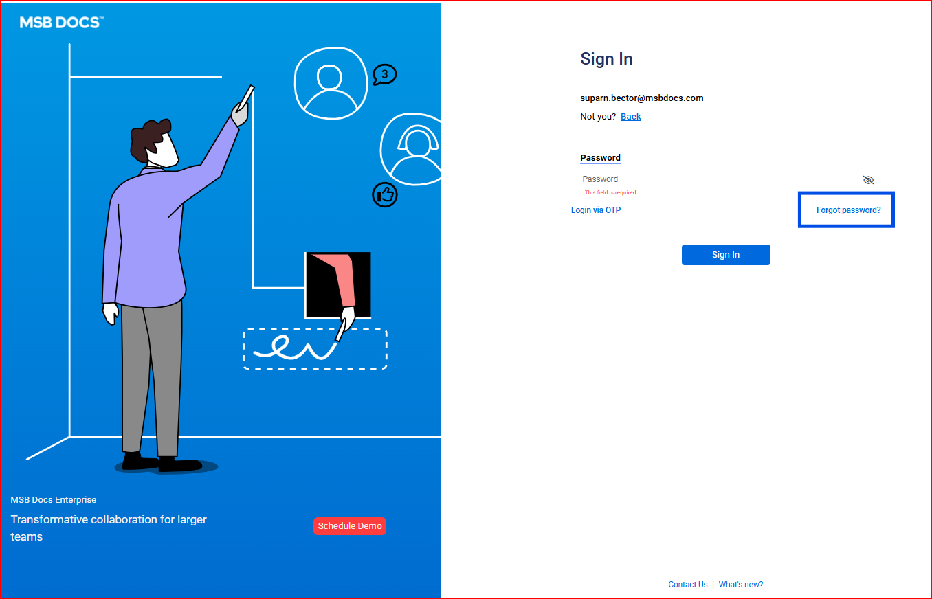 MSB users are given limited attempts to generate a password link from the Forgot Password page. The count of attempts will be captured against the entered email id on the Forgot Password page. Once the remaining available attempts reach zero the user will be blocked. After a specified amount of time has passed, a timer will reset the count in accordance with timer configuration, and the user will then be unblocked.