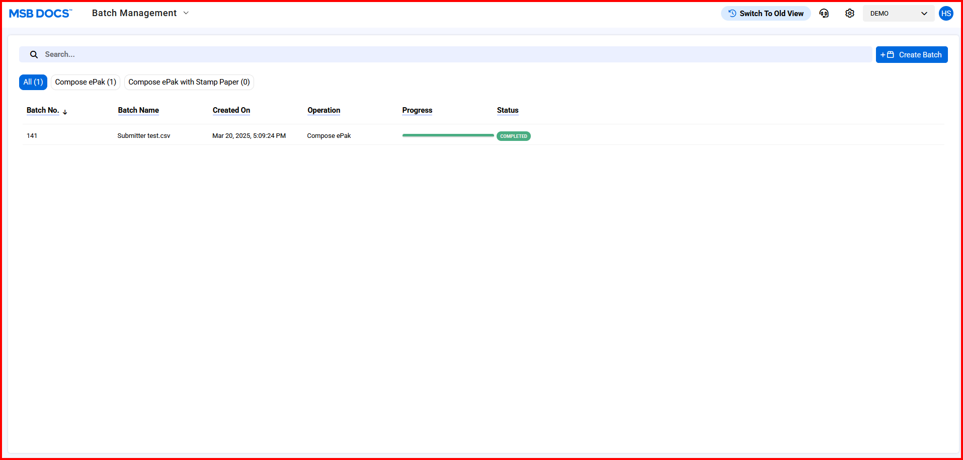 Users will be able to track and manage the progress of a bulk compose and bulk compose + stamp paper process by navigating to the batch management page where the Custodian can view the details like Batch No and Name, Operation Type, Status, Progress, Number of Entries Sent/Total Entries and Created On for each Batch.
