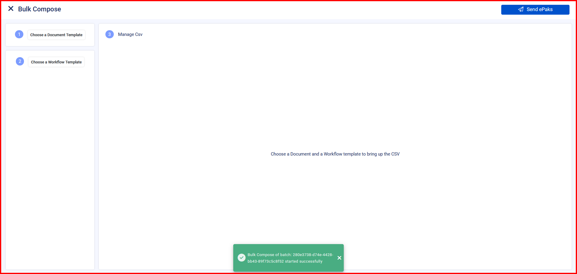 When a user successfully initiates a bulk compose process, a toast message with the format “Bulk compose with batch no: [Batch Number] has started” will be displayed on the bulk compose screen.