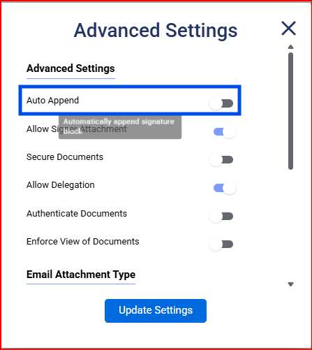 If your instance has been configured to enable Auto-append, you will see an Auto-append option in the Advanced Settings on the Compose page. By default, Auto-append is set to OFF. If you wish, you may set Auto-append to ON. Setting Auto-append to ON will tell application to automatically append a signature page to the end of your document and place all signature tags there. You will not be required to drag and drop any signature tags onto your document for your signers.