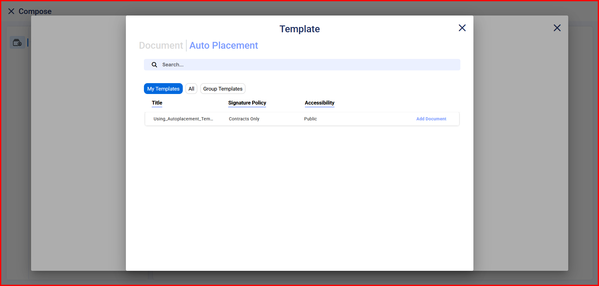 2. Click on Auto Placement Template and all templates (created by you or shared publicly) will be listed. Select the template you would like to use by clicking on ‘Add Document’.