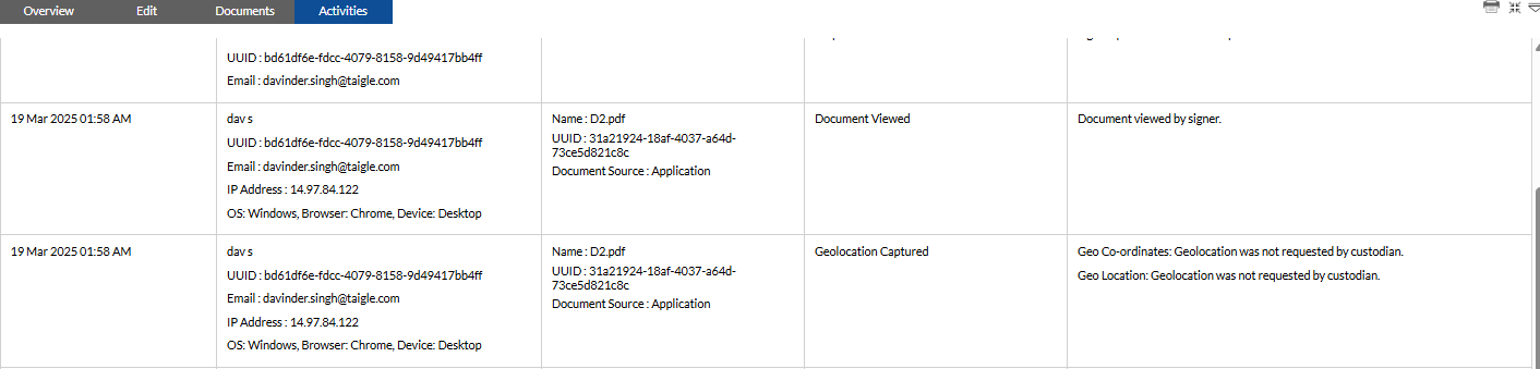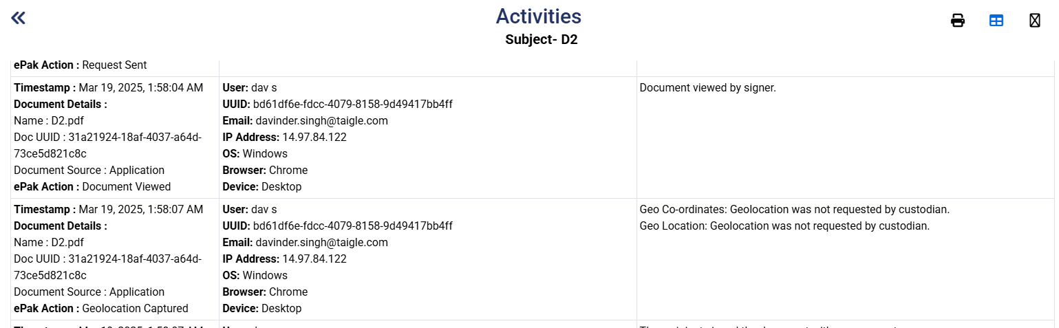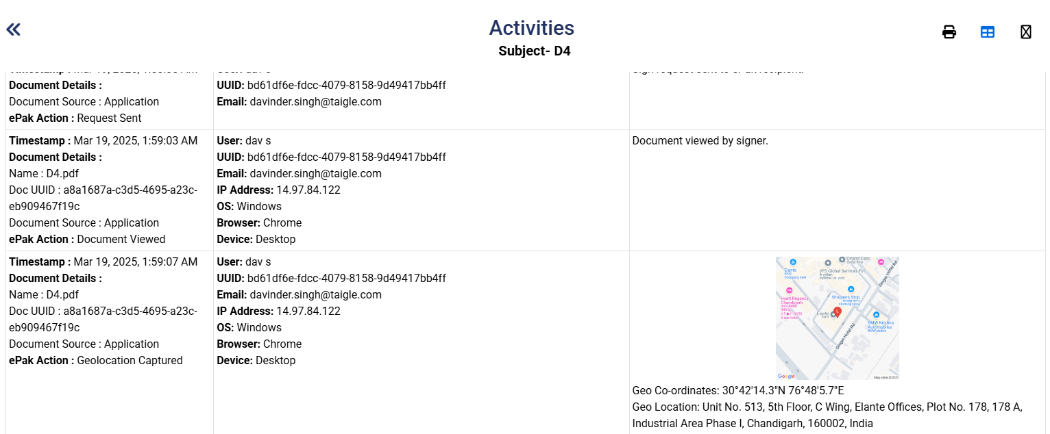 A new action called Geo Location is captured in the e-Photocopy Audit Trail which will get added just before the ‘signed’ action. Details to be added along the action are, Image of the Location, Geolocation Coordinates, and Geo Location. Geo Location is incorporated into the activities section on the ePak details page, and each activity includes Image, Geo Location Coordinates, and Geo Location.