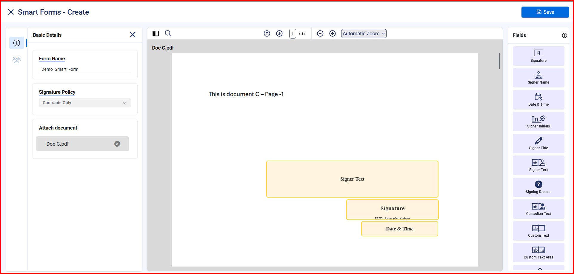 After uploading the document, users will be able to drop the tags and the signing policy will be selected as Contracts Only by default. Users will be able to see the previously created and the newly created forms. They can also view, edit, and delete the existing document present inside the form.