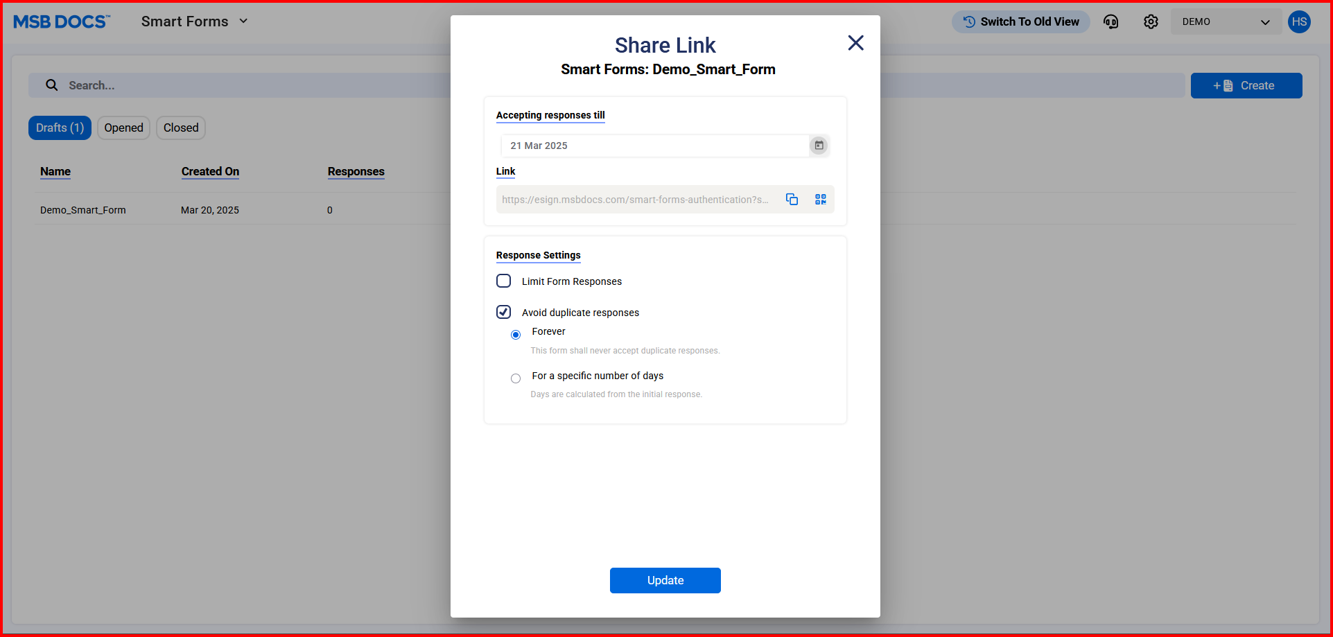 Admin/Custodian users will be able to generate a public link or a scannable QR code for the form template and copy and share the link. User can set an expiry date of the link after which the form will not be accessible using the link. When the signer clicks on the smart form public link, they will be redirected to the form.